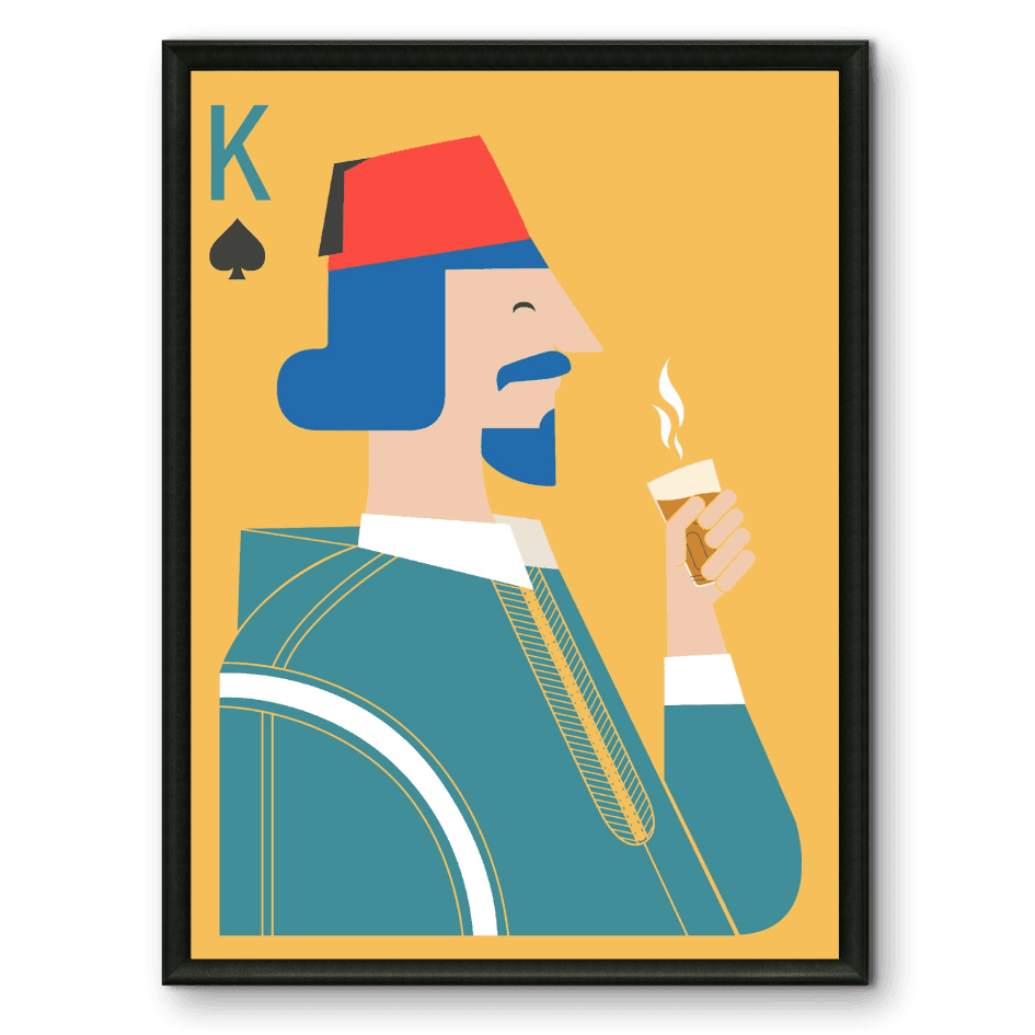 Illustration moderne du roi des cartes revisité avec un style marocain, portant un fez rouge et savourant un thé à... Read more