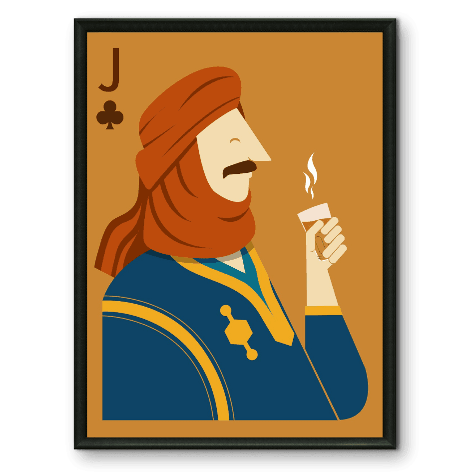 Représentation contemporaine du valet des cartes en habit traditionnel marocain, coiffé d’un chèche rouge et dégustant un thé, sur fond... Read more