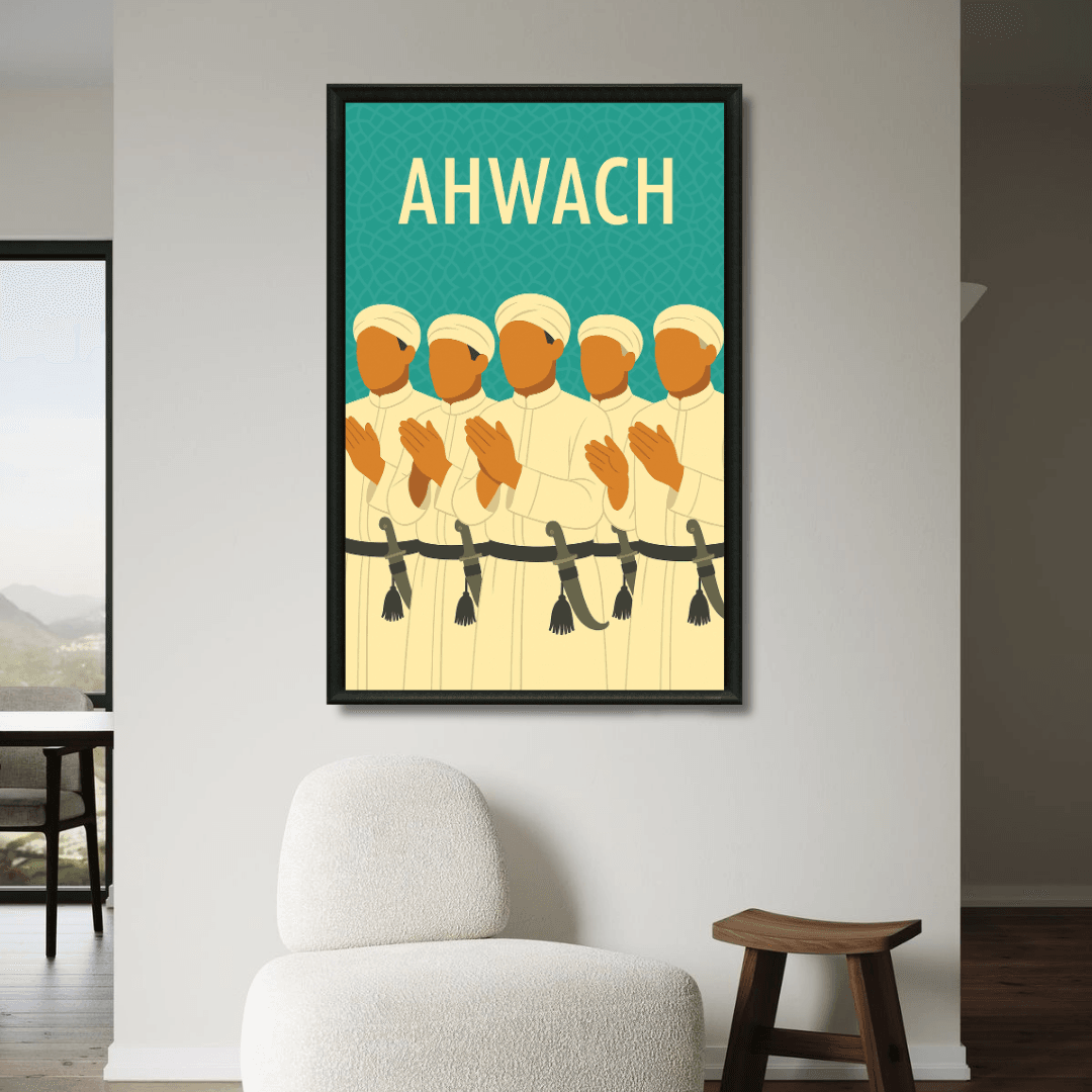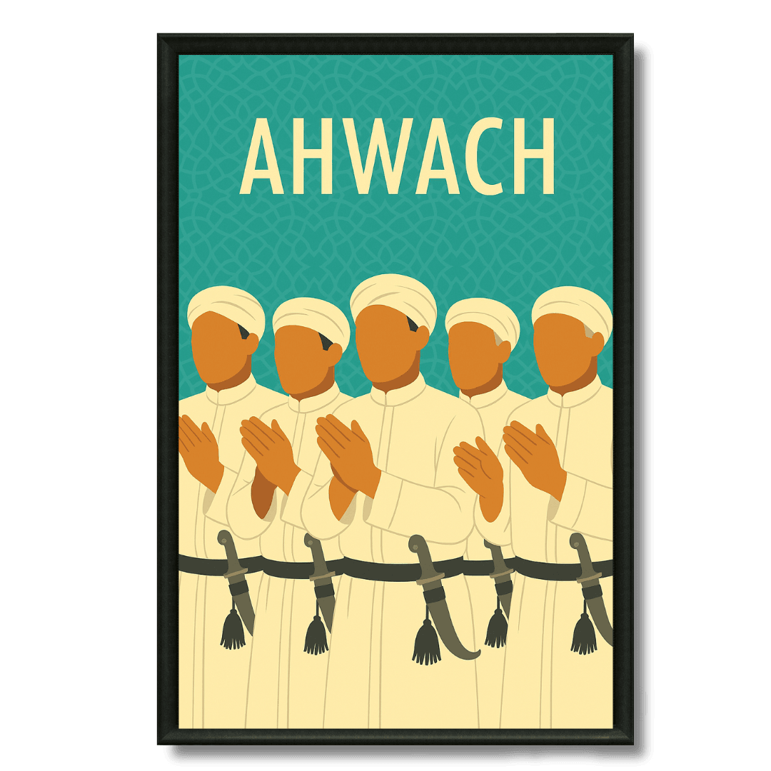 Illustration stylisée d’un orchestre Ahwach, musique populaire marocaine, incontournable dans les mariages et fêtes traditionnelles. ✔ Impression haut de gamme sur... Read more