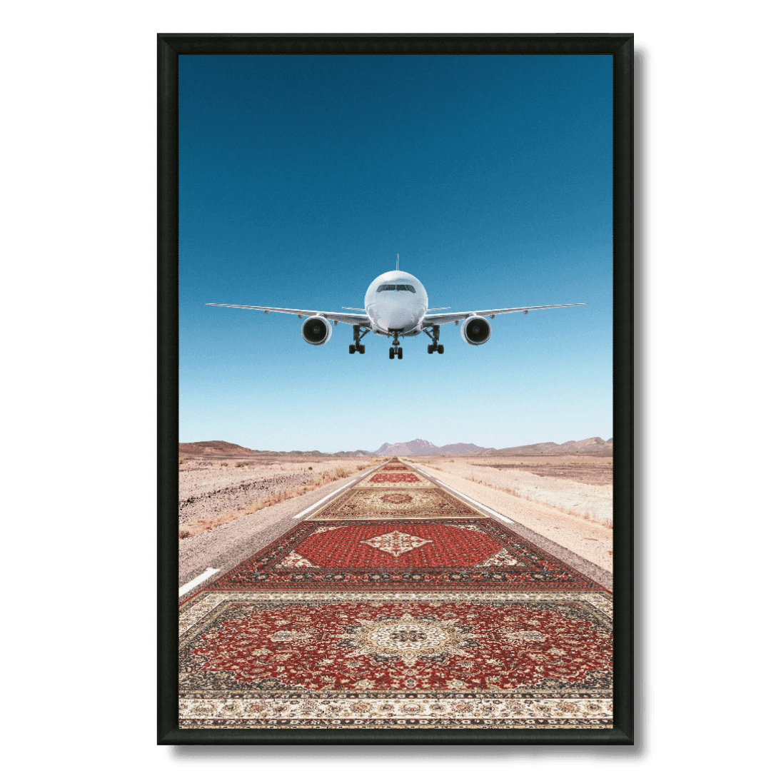 Un tableau unique où un avion atterrit sur une piste recouverte de tapis orientaux, dans un paysage désertique époustouflant. Parfait... Read more