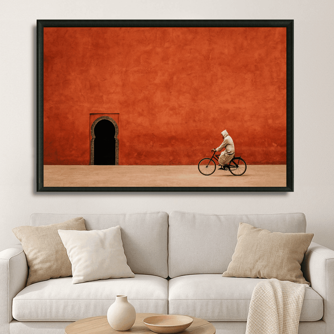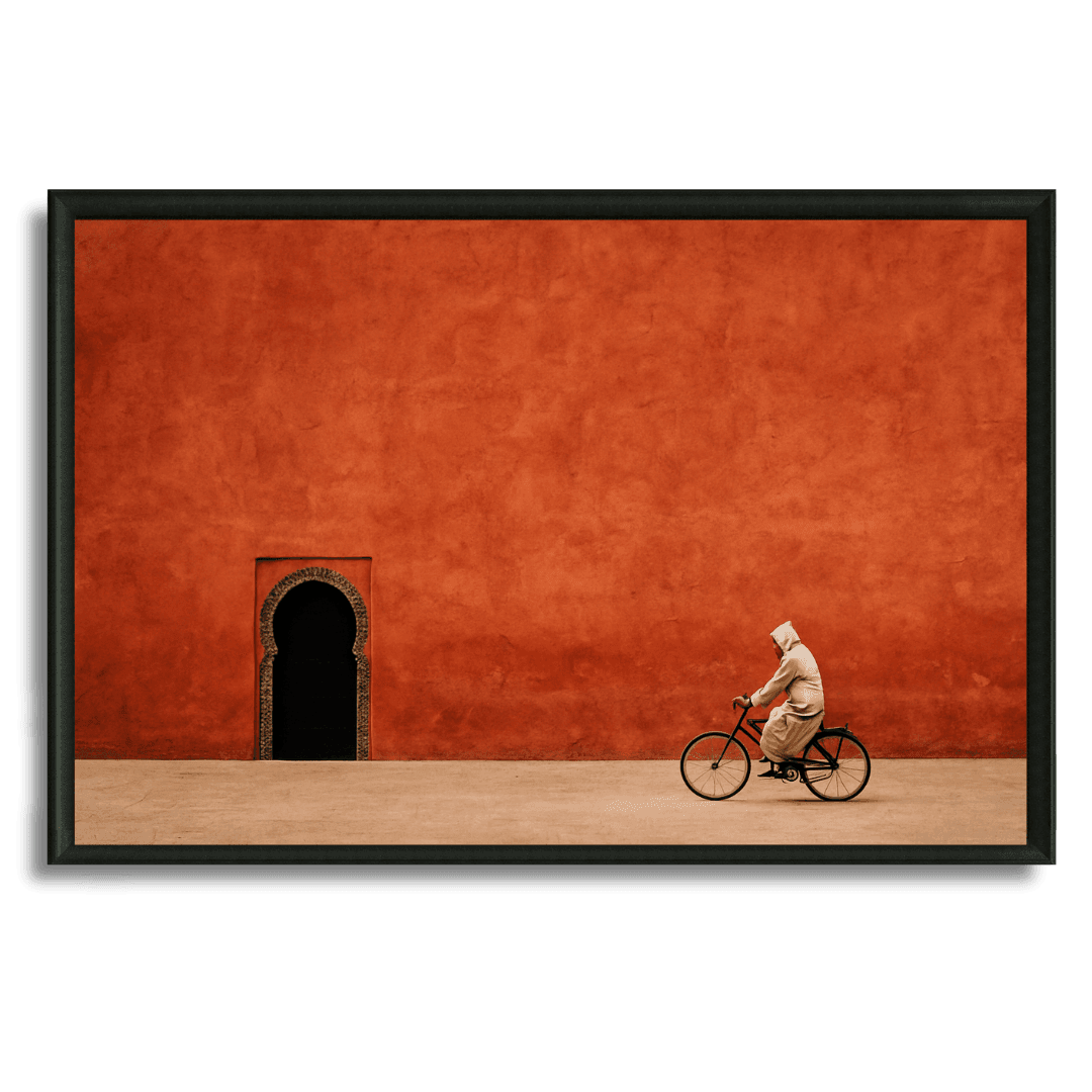 Illustration murale inspirée du Maroc, montrant un cycliste en djellaba devant un mur rouge profond et une arche traditionnelle. Parfait... Read more