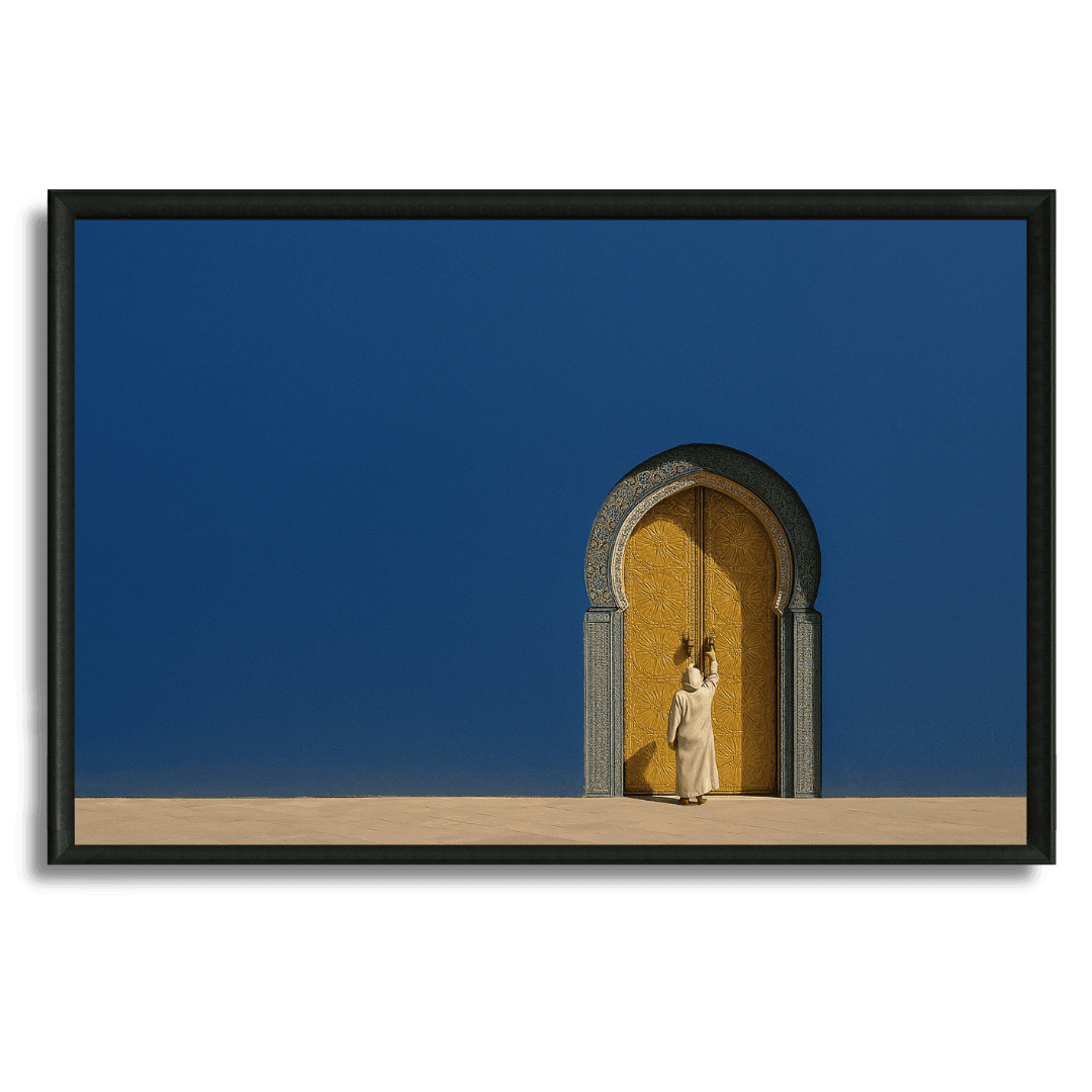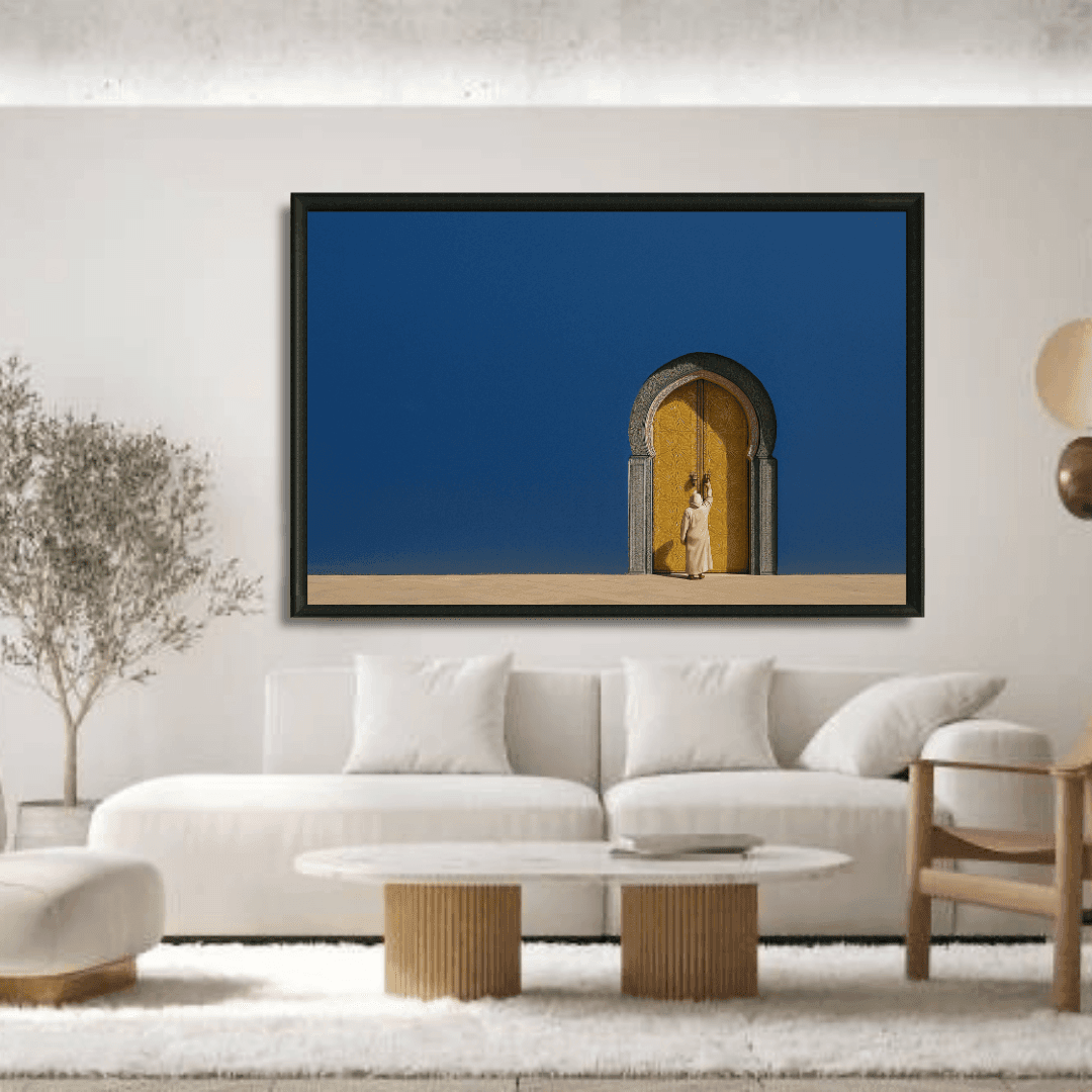 Œuvre murale marocaine contrastant un mur bleu profond et une porte dorée finement travaillée. Idéale pour une déco élégante et... Read more
