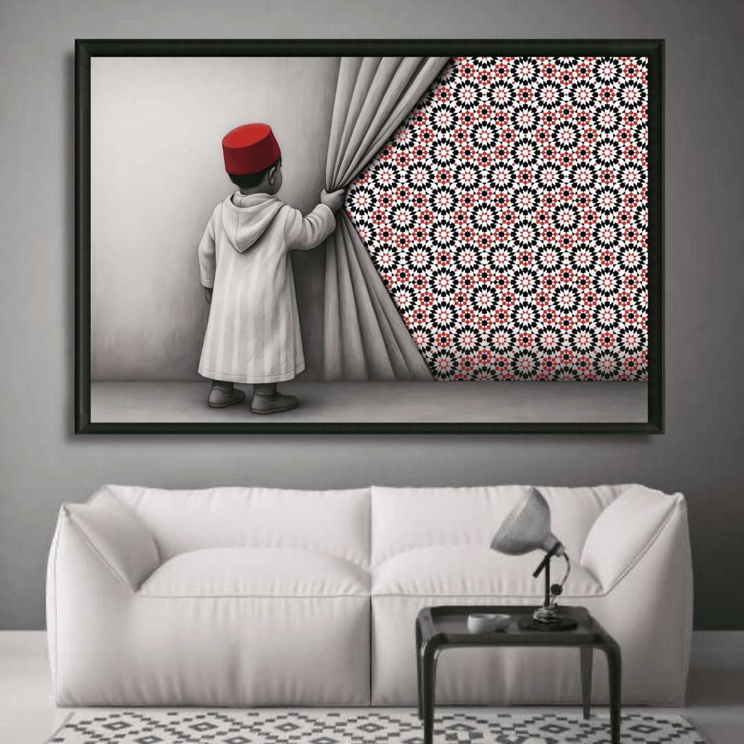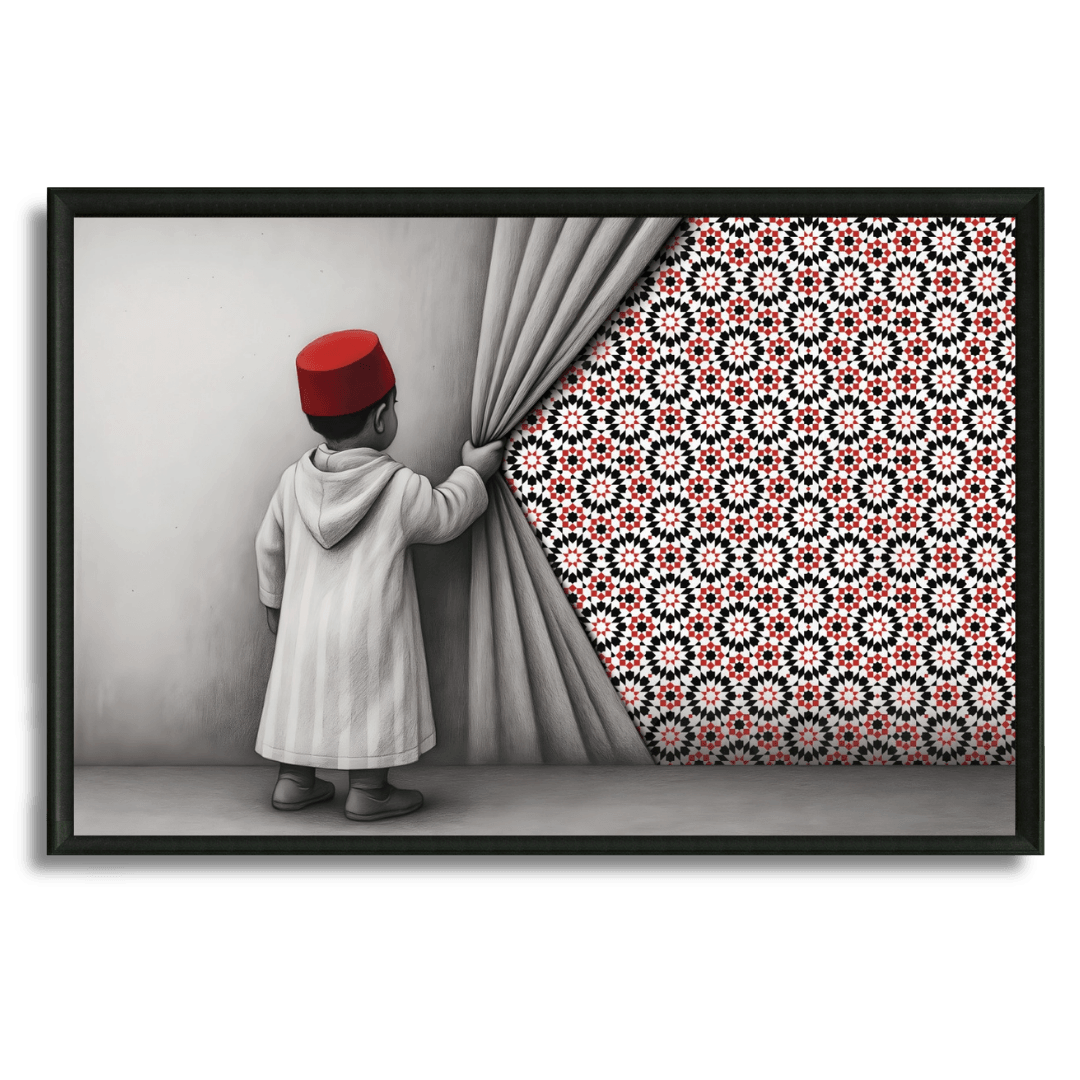 Ce tableau poétique montre un enfant en habit traditionnel dévoilant un mur de zellige rouge et noir. Une œuvre qui... Read more