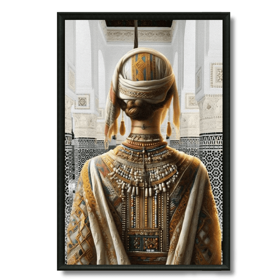 Un hommage à la culture amazighe à travers ce tableau détaillé d’une femme vue de dos, portant des bijoux et... Read more