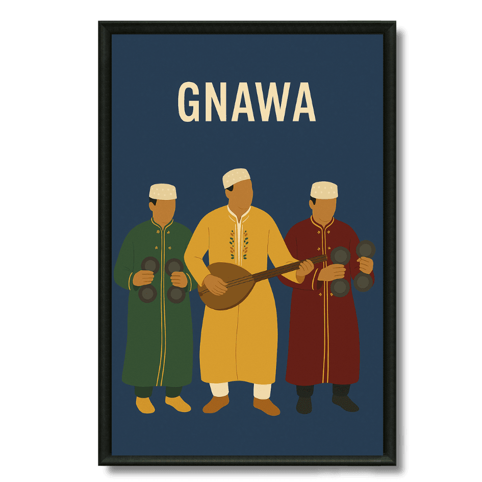Illustration colorée représentant un groupe Gnawa, fusion de musique africaine et arabe, reconnue pour ses rythmes hypnotiques et rituels ancestraux.... Read more