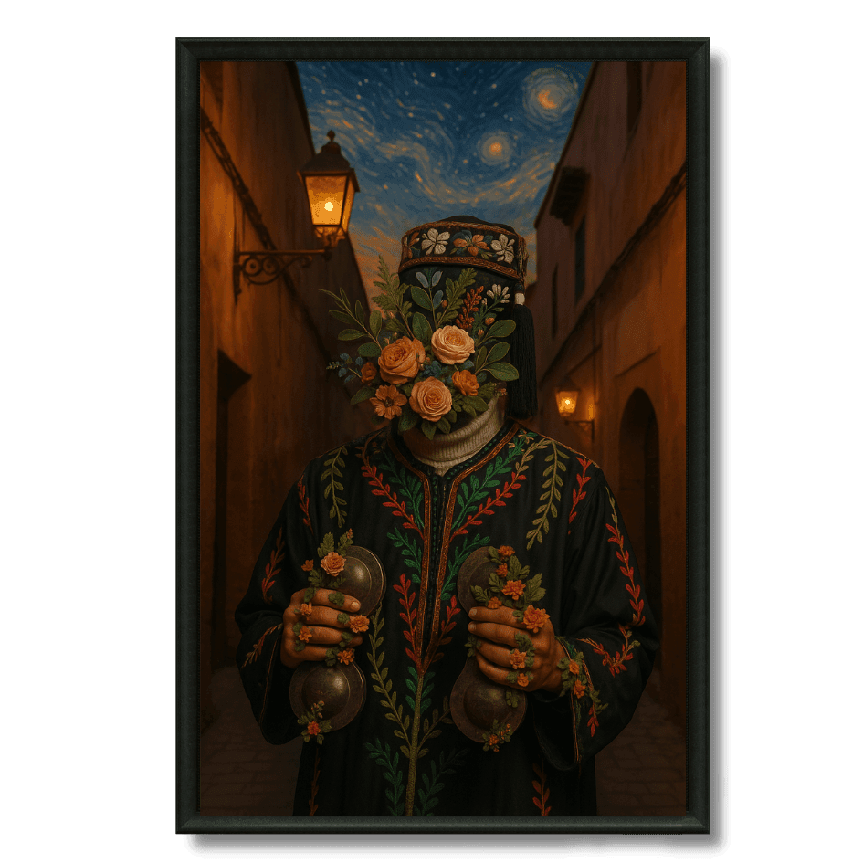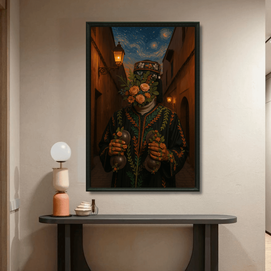 Tableau Portrait onirique d’un musicien Gnawa, visage floral, jouant dans une ruelle éclairée. Tableau vibrant inspiré des traditions marocaines. ✔ Impression... Read more