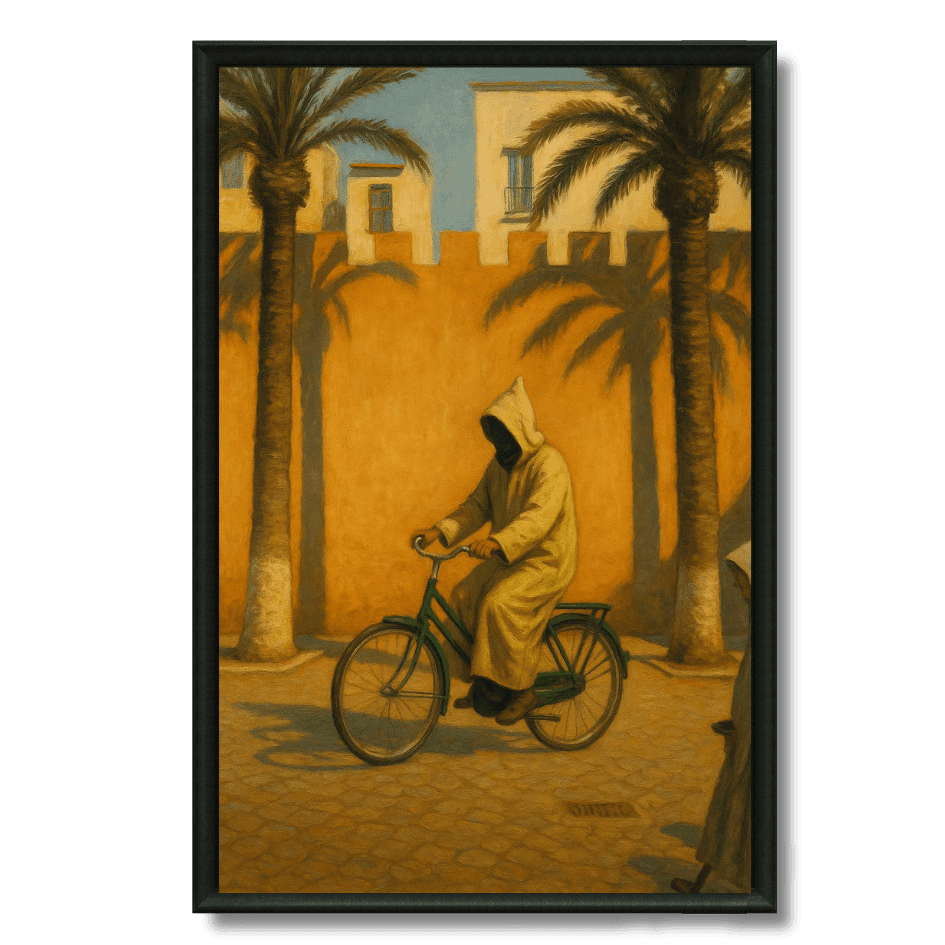 Tableau représentant un homme en djellaba beige pédalant dans une rue bordée de palmiers et de murs ocre, capturant la... Read more