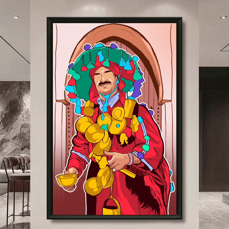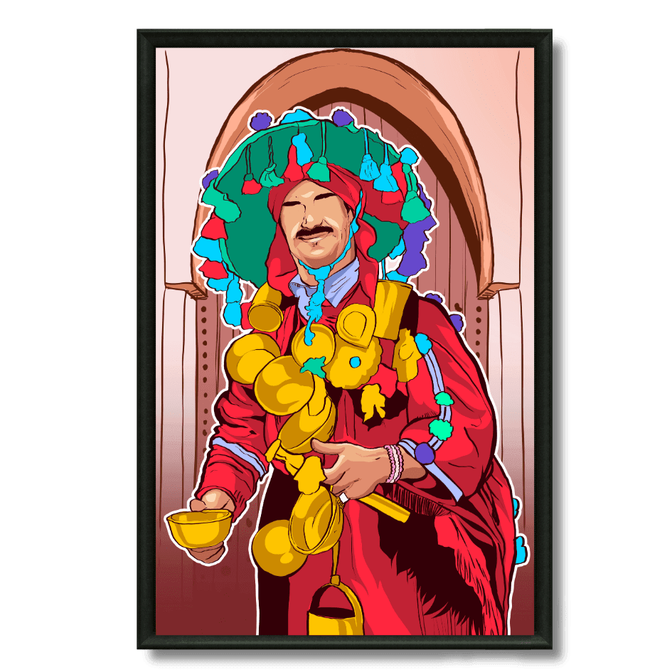Cette illustration colorée met en valeur le guerrab, figure emblématique des souks marocains, avec son costume rouge, son large chapeau... Read more