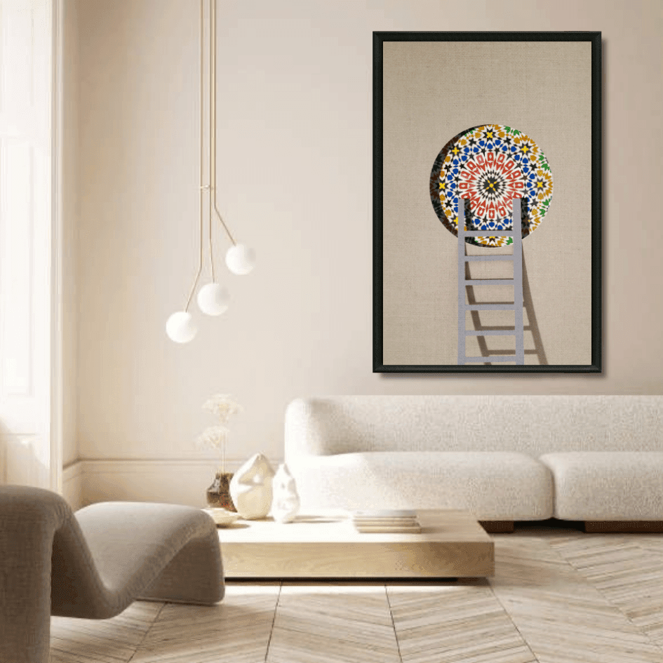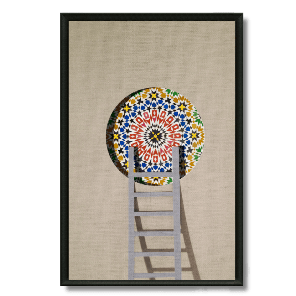 Une composition visuelle originale où une échelle traverse des motifs traditionnels marocains, créant un contraste moderne. ✔ Impression haut de... Read more