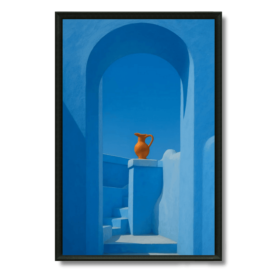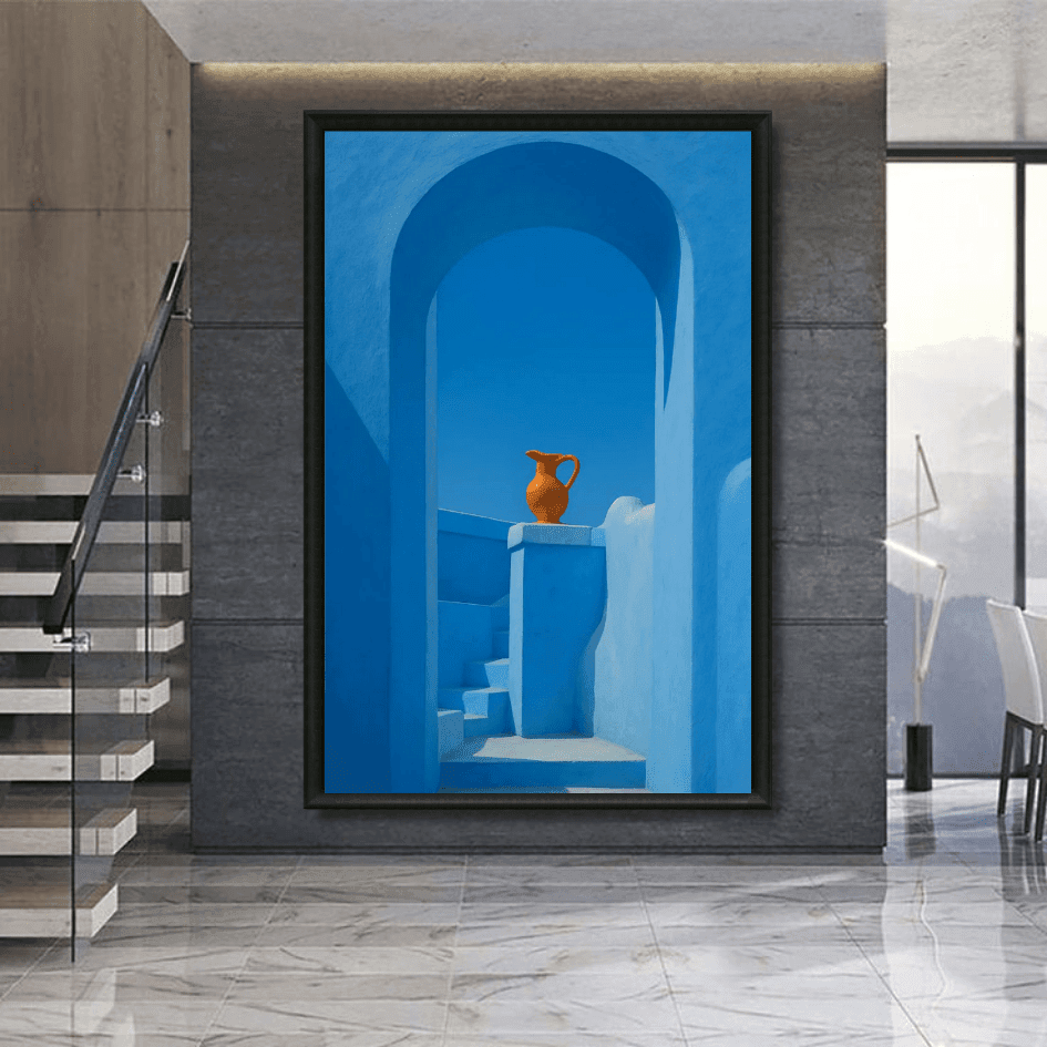 Sublimez vos murs avec ce tableau inspiré de Chefchaouen. Tons bleus apaisants, cruche en terre cuite, style minimaliste marocain. Idéal... Read more