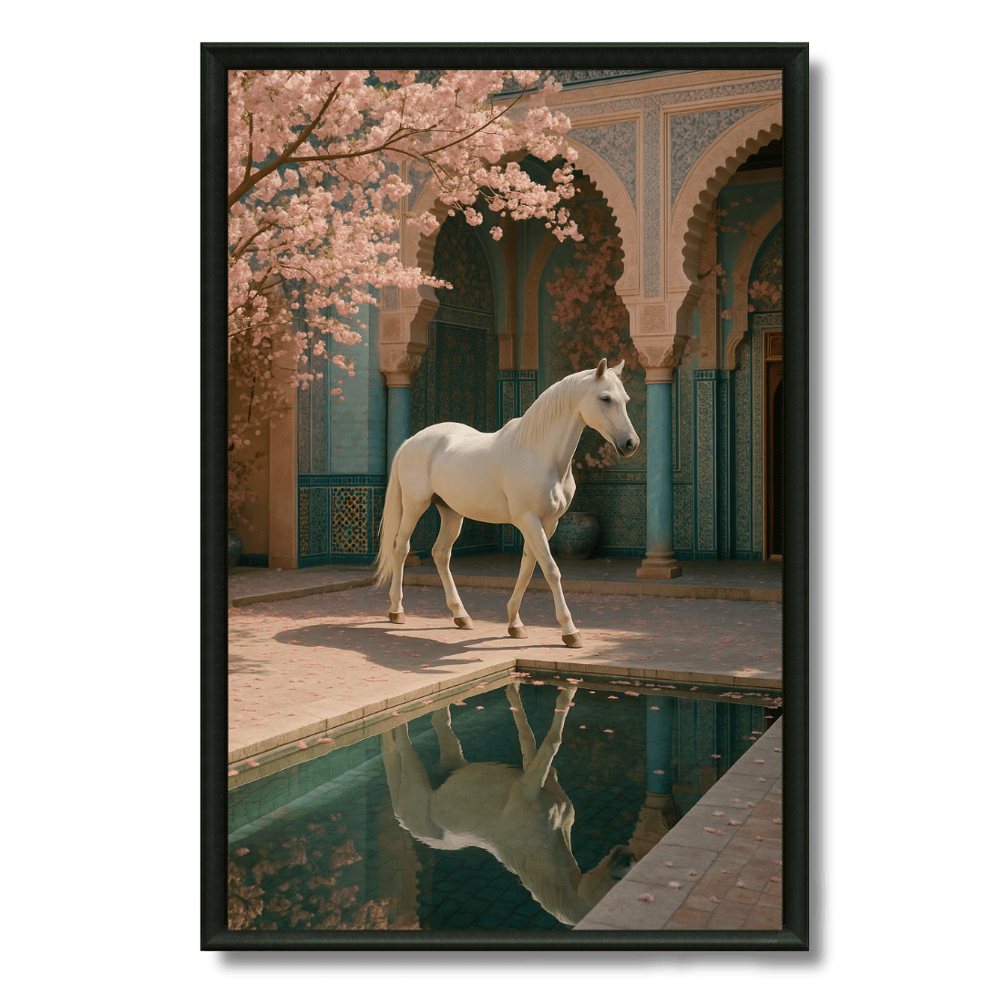 Découvrez Le cheval du Riad Rose marocain avec ce cadre mural raffiné représentant un cheval ce baladant dans un riad... Read more