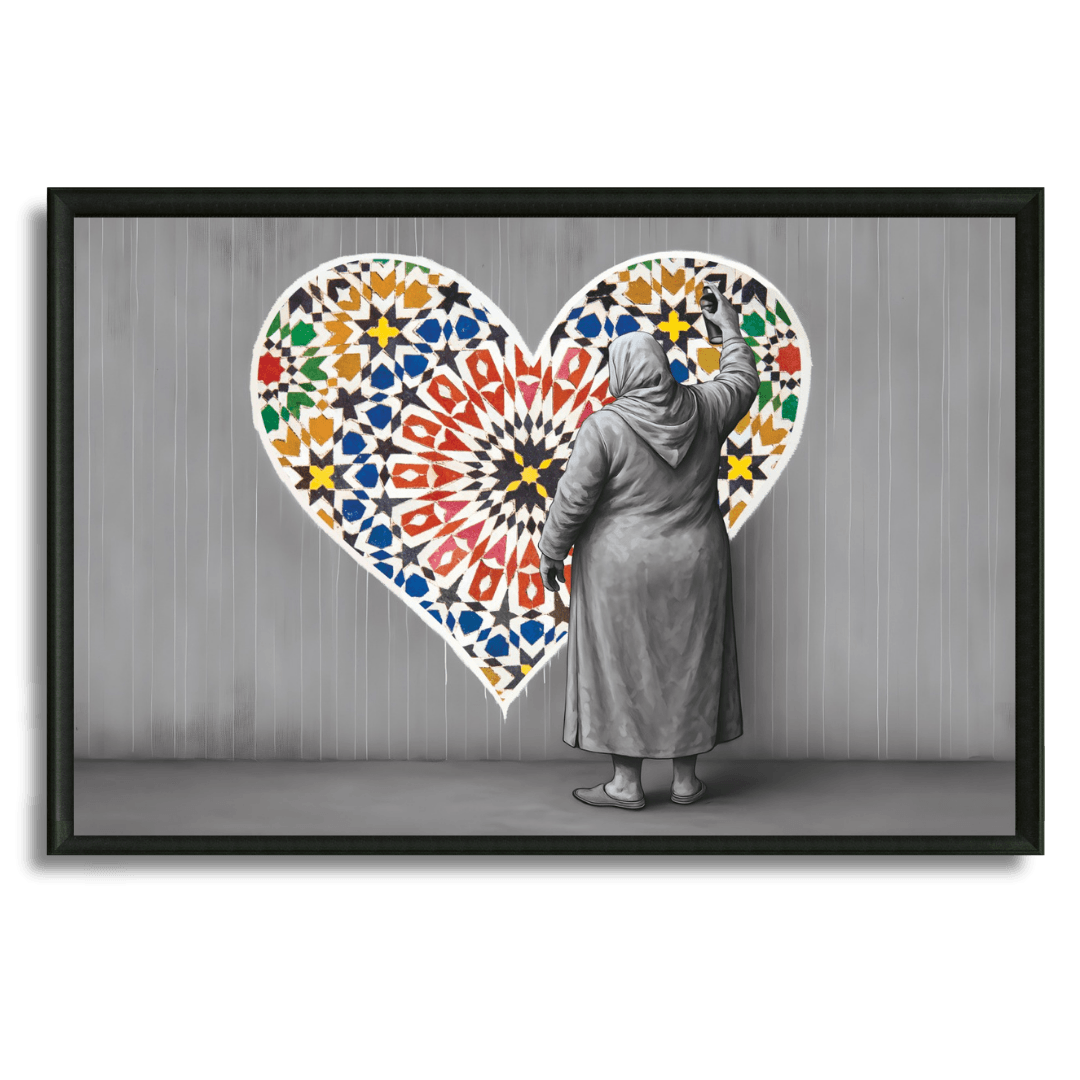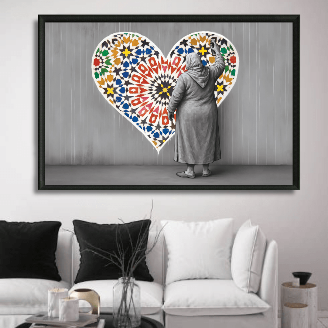 Symbole d’amour et de tradition, ce tableau montre une femme peignant un cœur en zellige coloré. Une décoration marocaine pleine... Read more