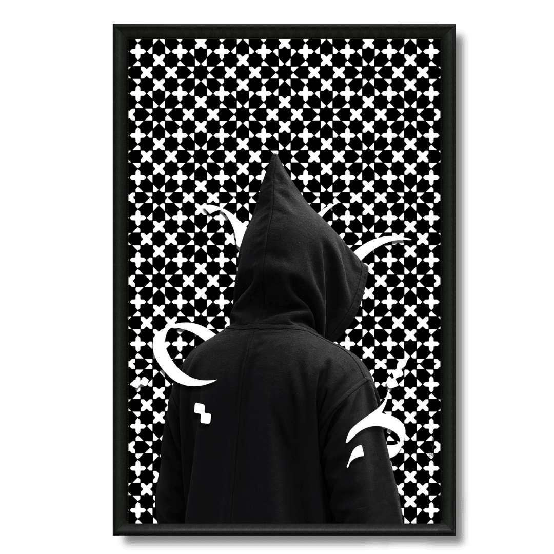 Tableau minimaliste d’un homme vu de dos en djellaba noire, avec motifs marocains noirs et blancs et touches de calligraphie.... Read more