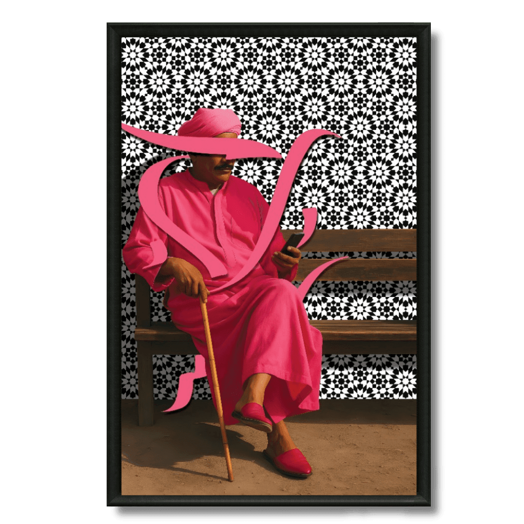 Illustration colorée d’un homme marocain assis sur un banc, vêtu d’une djellaba rose, avec motifs traditionnels noirs et blancs et... Read more