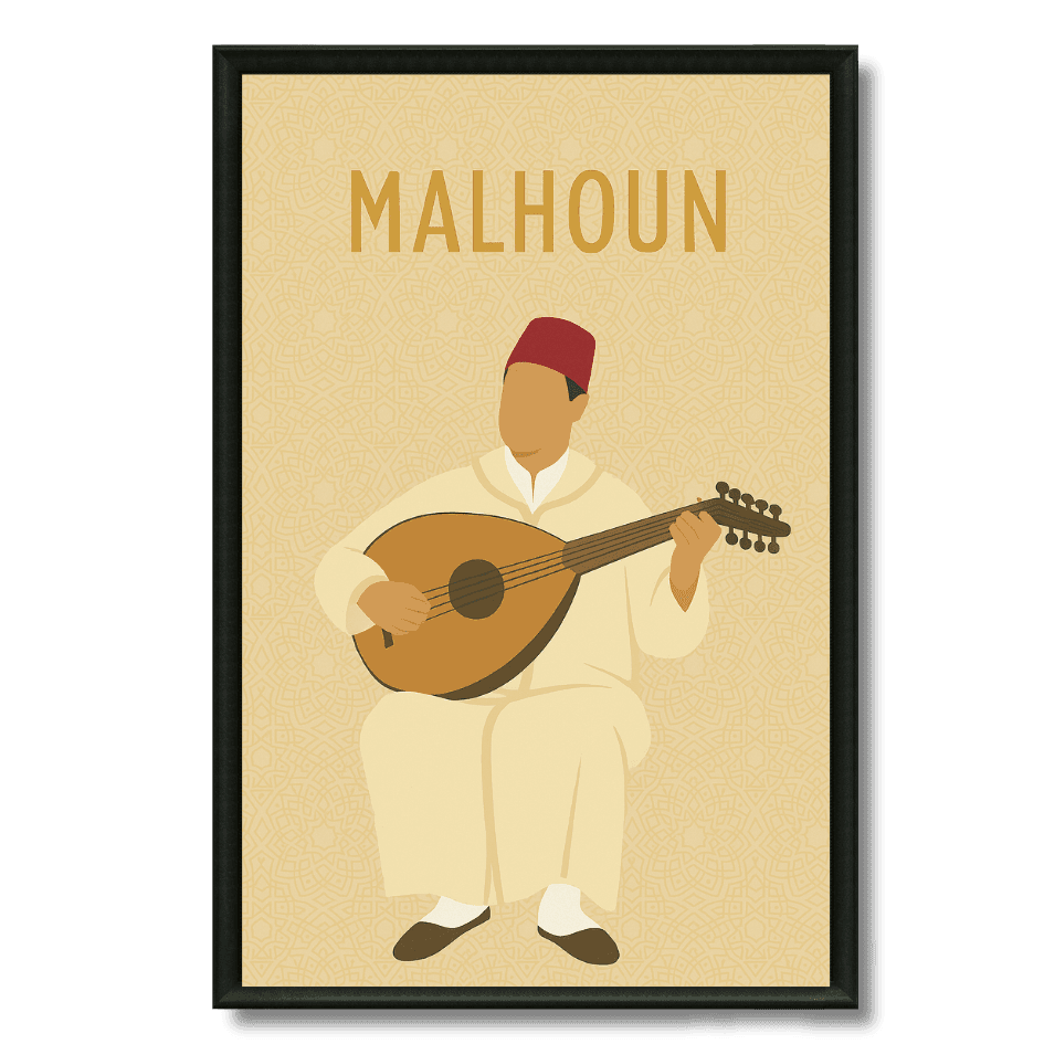 Illustration d’un musicien de Malhoun, art poétique et musical marocain mêlant mélodies andalouses et poésie populaire. ✔ Impression haut de gamme... Read more