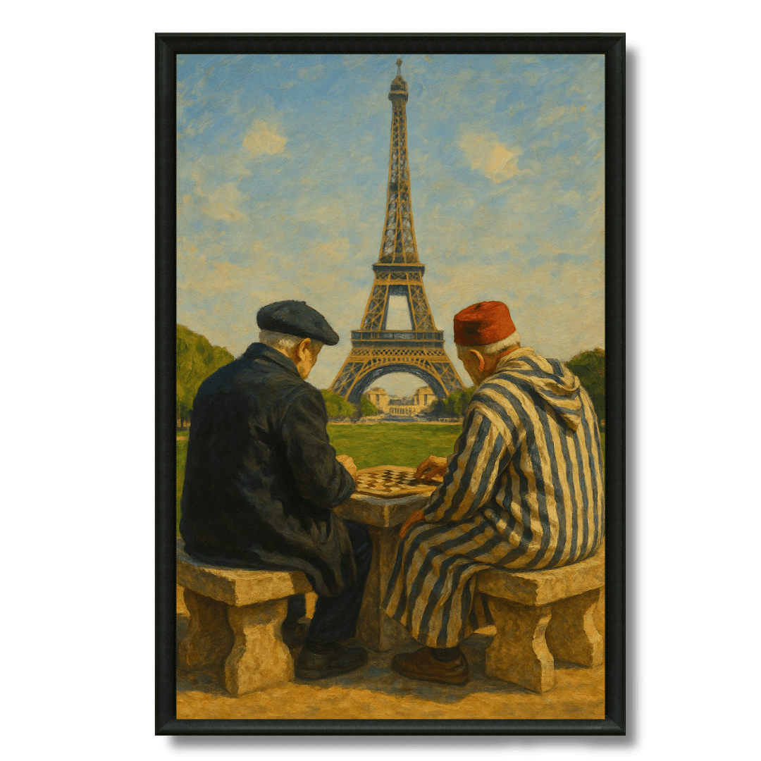 Plongez dans une atmosphère apaisante avec ce tableau représentant un homme marocain et un autre Français jouant aux dames en... Read more