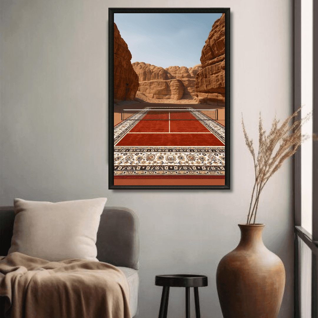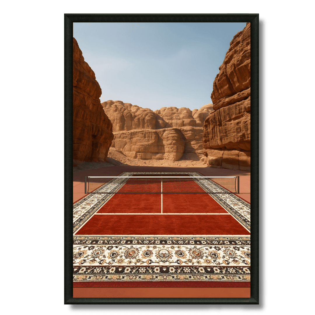 Une scène surprenante mêlant sport et tradition : un terrain de tennis au milieu d’un canyon, habillé d’un tapis persan.... Read more