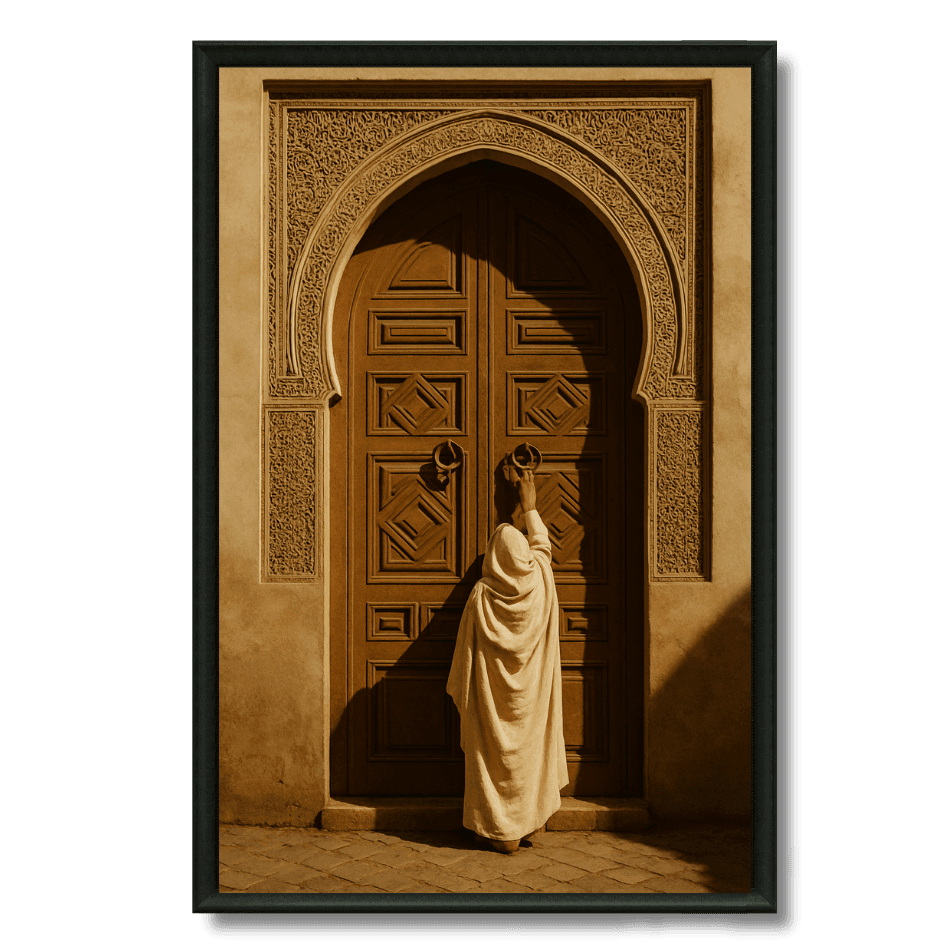 Photographie élégante d’une porte marocaine finement sculptée, avec une femme en djellaba blanche frappant à l’entrée. Un tableau riche en... Read more