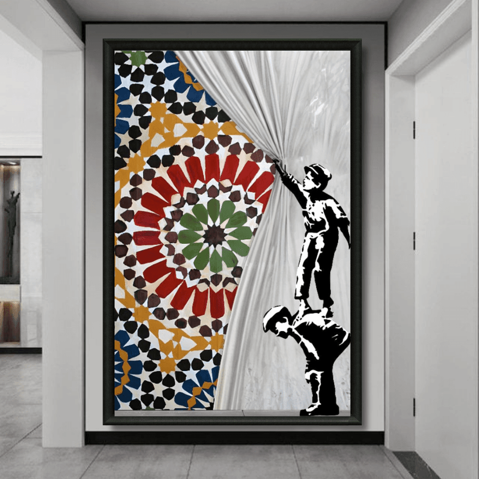 Inspirée de la fameuse Œuvre, ce tableau représente deux enfants tirent un rideau révélant des motifs marocains traditionnels. Un mélange... Read more