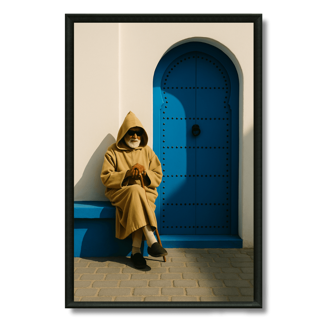 Un tableau qui capture l’essence des médinas marocaines : un vieil homme en djellaba beige, assis devant une porte bleue... Read more