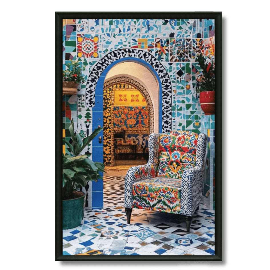 Œuvre murale vibrante capturant un arc marocain orné de mosaïques colorées et un fauteuil assorti. Une invitation au voyage au... En savoir plus