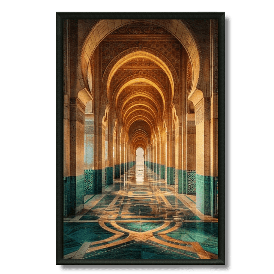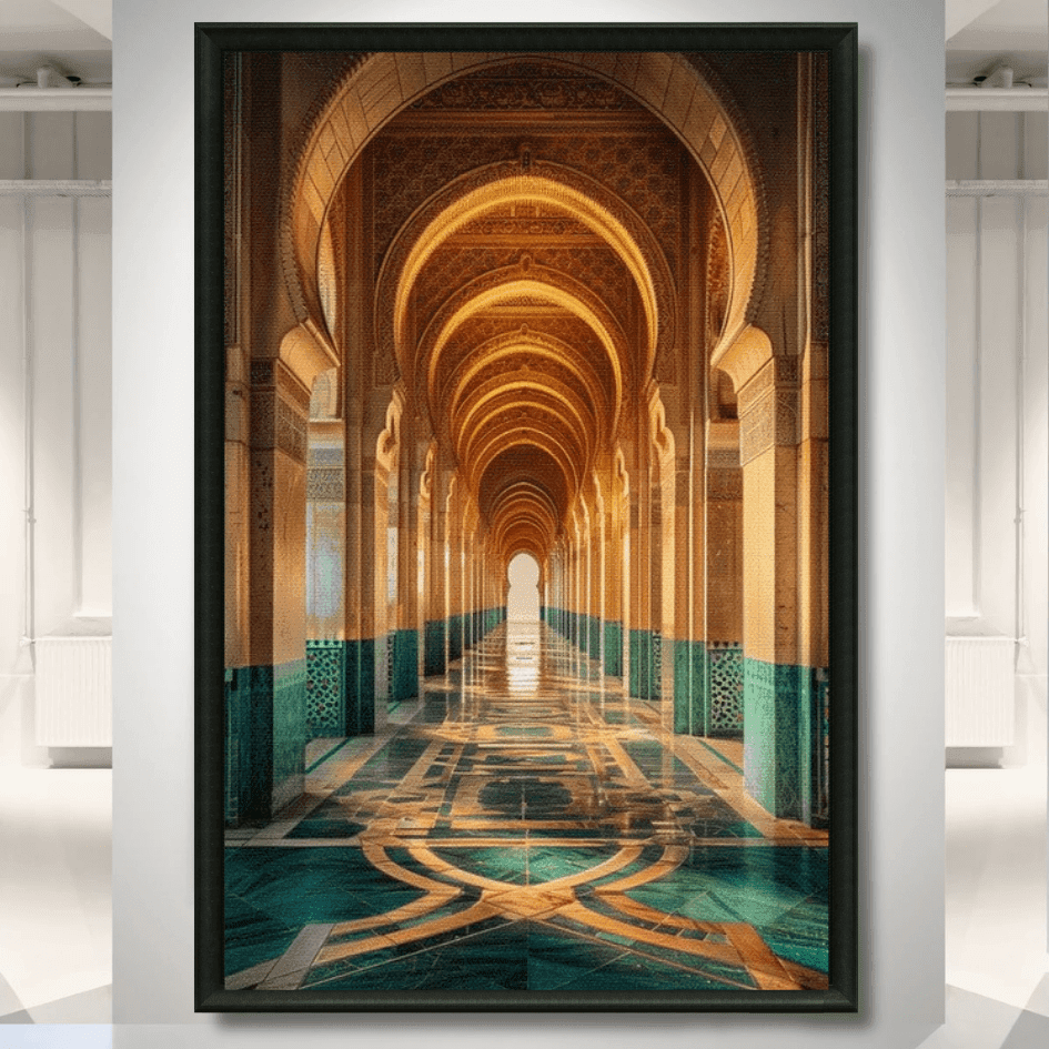Tableau artistique de la galerie dorée , avec sols en zellij turquoise et arches monumentale. Atmosphère élégante et mystérieuse. ✔ Impression... En savoir plus