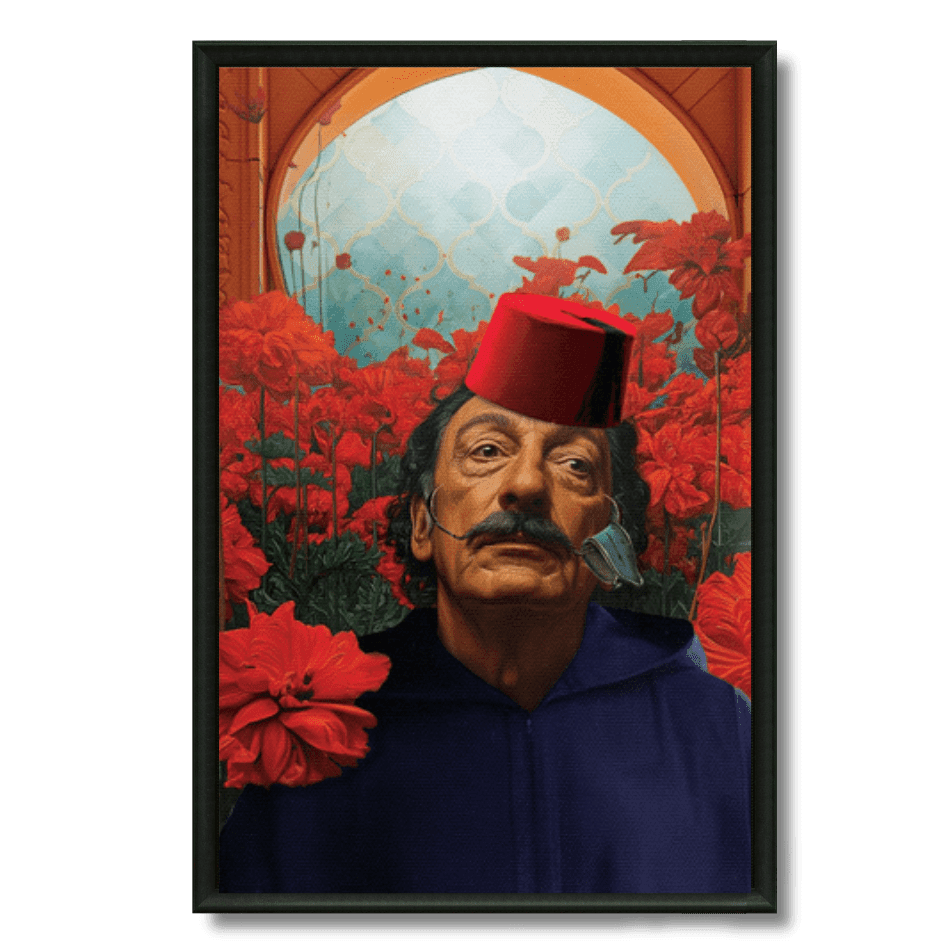 Tableau surréaliste représentant Salvador Dalí en tarbouche et djellaba, entouré de fleurs rouges dans un décor marocain. Une fusion audacieuse... En savoir plus