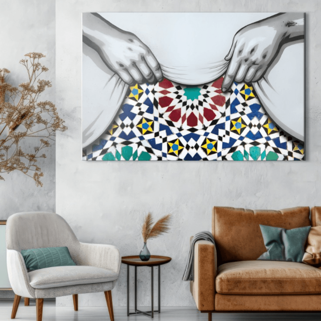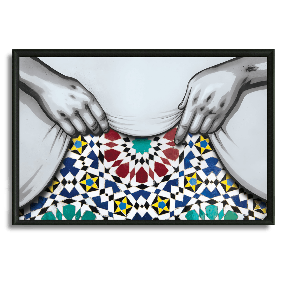 Une œuvre originale mêlant street art et tradition marocaine. Deux mains soulèvent le voile pour révéler un zellige étoilé aux... En savoir plus