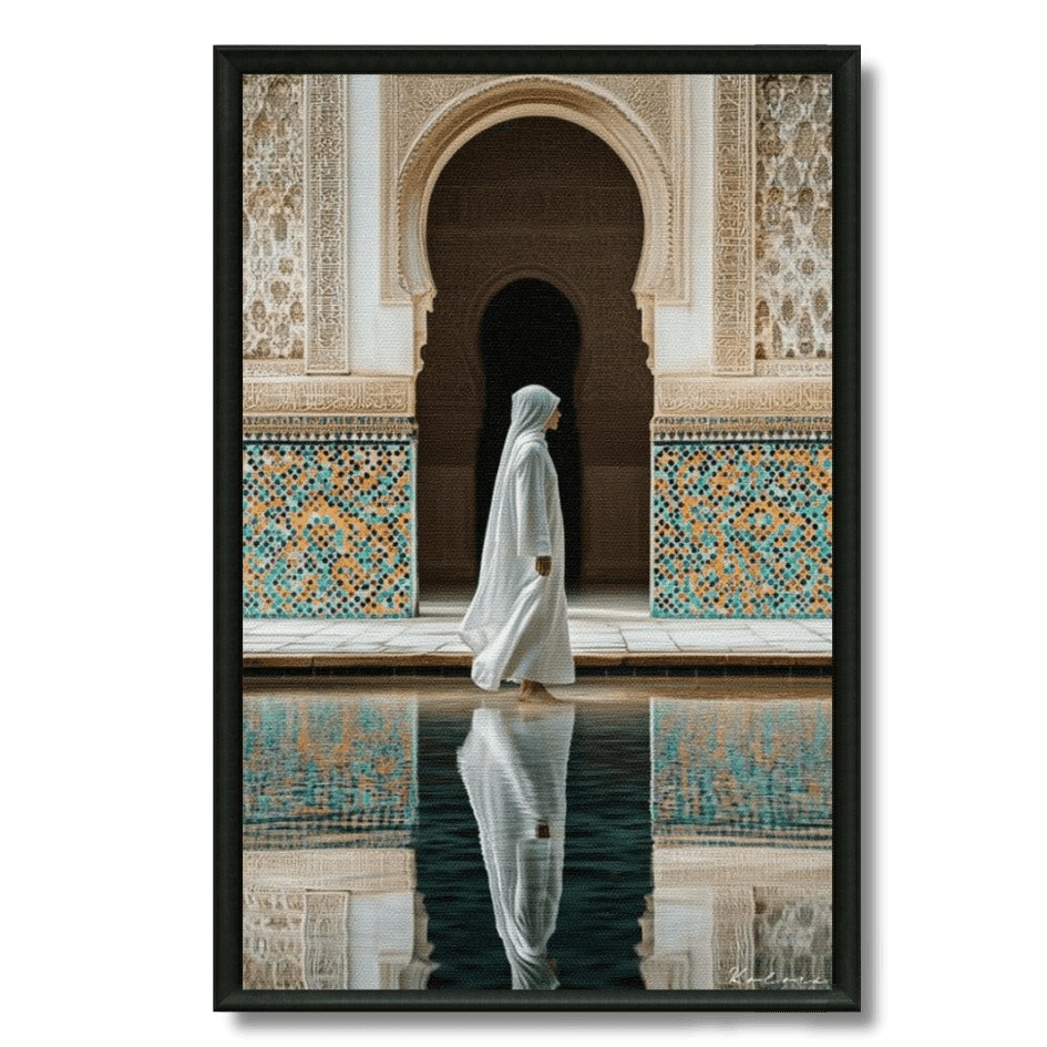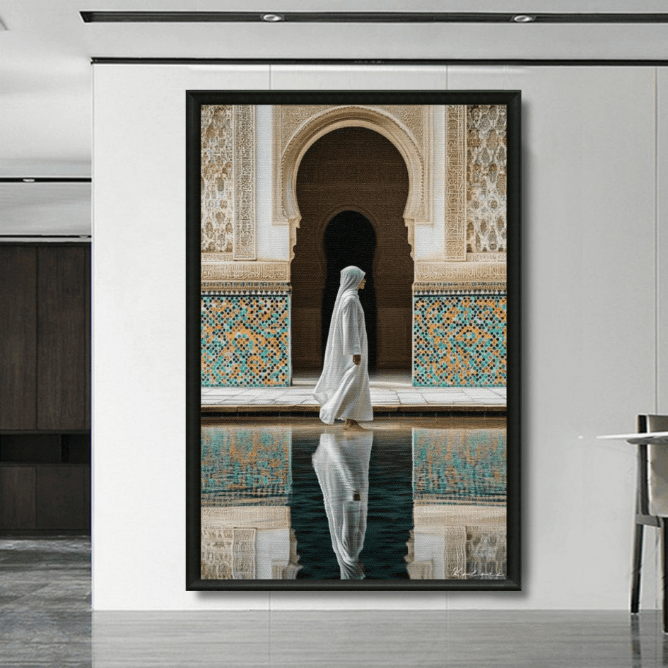 Découvrez ce tableau raffiné d’une femme voilée marchant au bord d’un bassin dans un riad marocain, sublimé par le zellij... En savoir plus