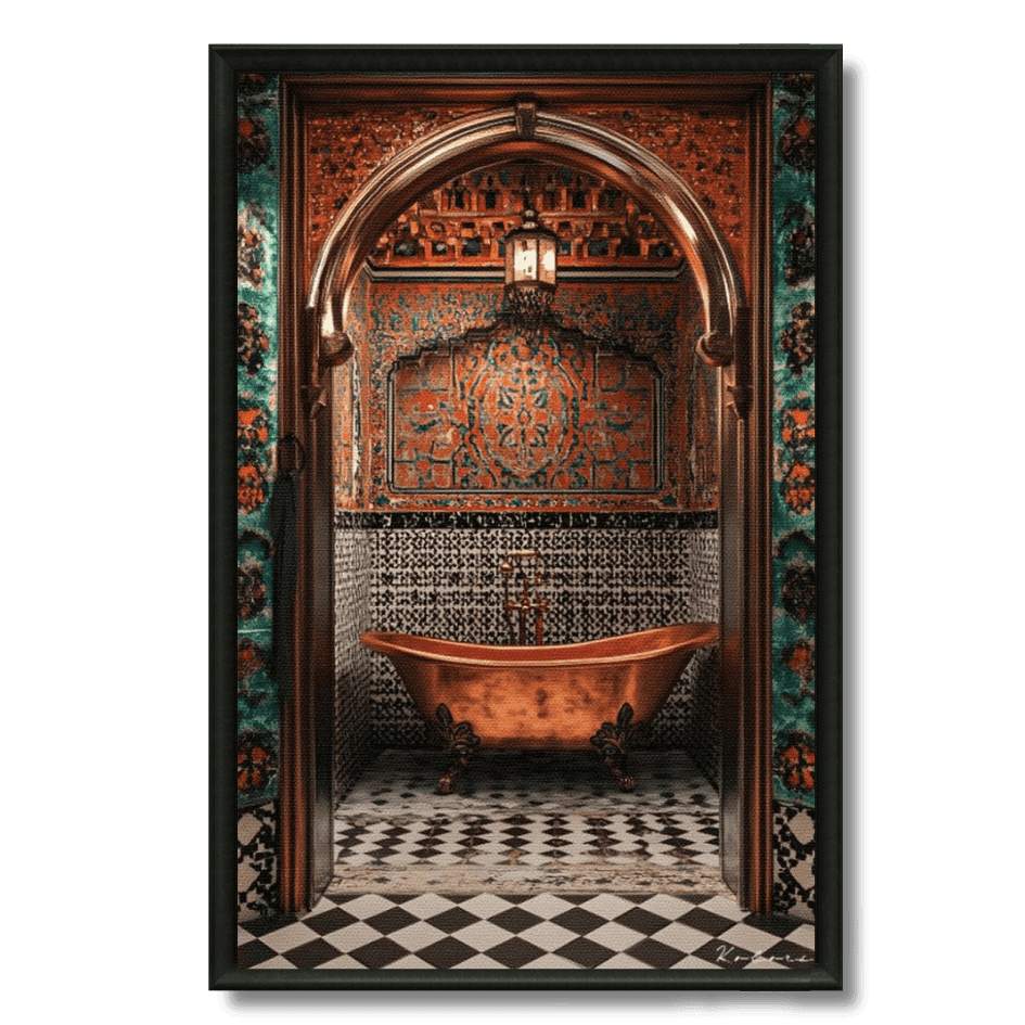Plongez dans l’élégance du hammam marocain avec cette œuvre mettant en valeur une baignoire en cuivre dans un décor arabo-andalou... En savoir plus