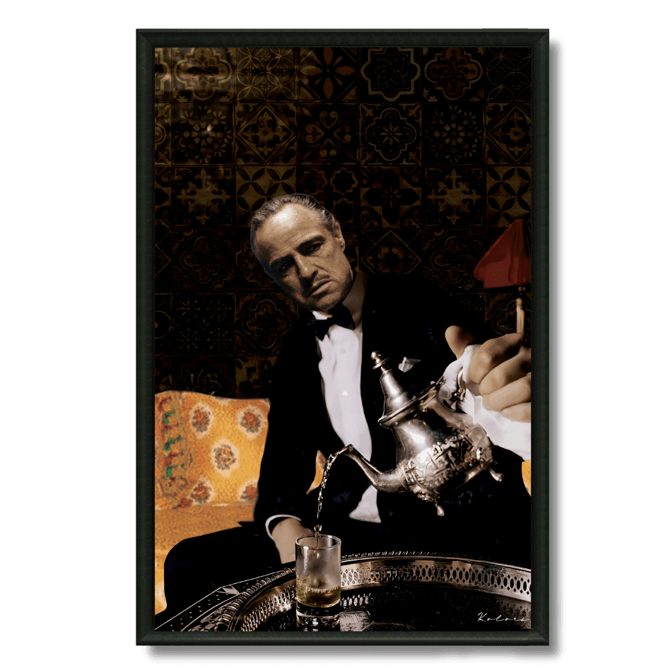Interprétation artistique de Don Vito Corleone (Le Parrain) servant un thé à la menthe dans un décor marocain traditionnel. Une... En savoir plus