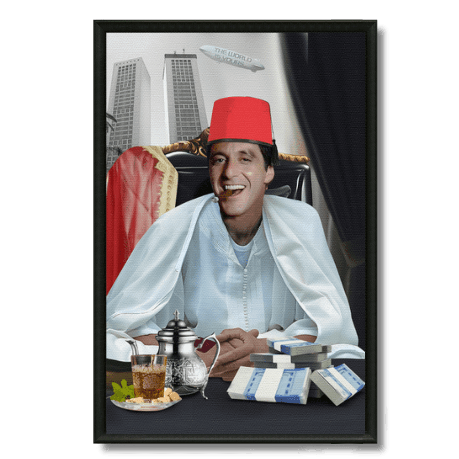 ableau unique représentant Tony Montana revisité à la marocaine, en djellaba et tarbouche, entouré de billets et thé à la... En savoir plus