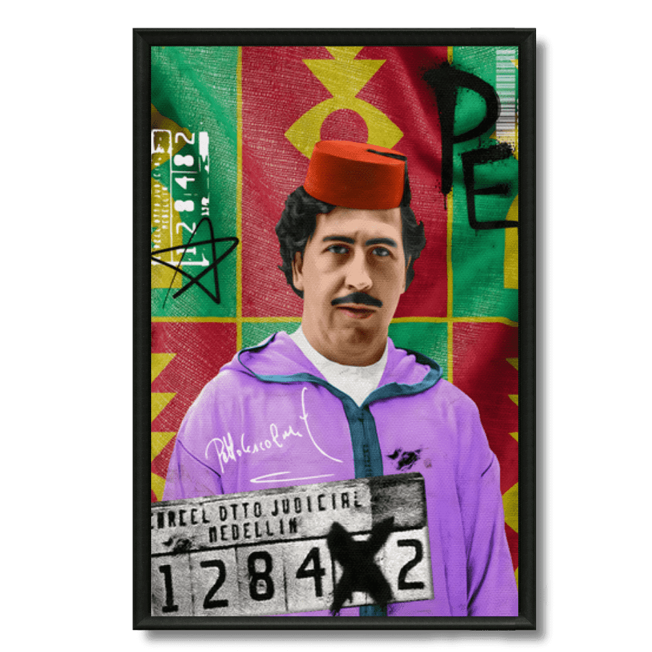 Œuvre originale représentant Pablo Escobar vêtu d’une djellaba et tarbouche rouge, sur fond graphique inspiré du Maroc. Un tableau pop... En savoir plus