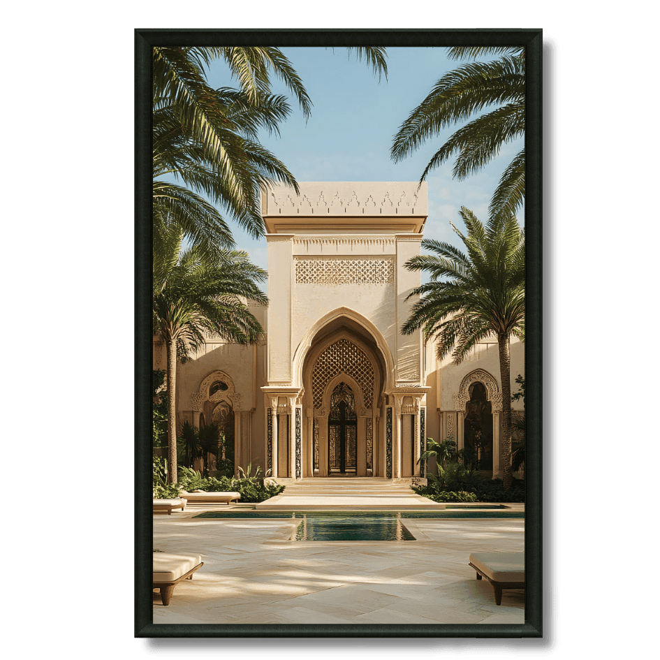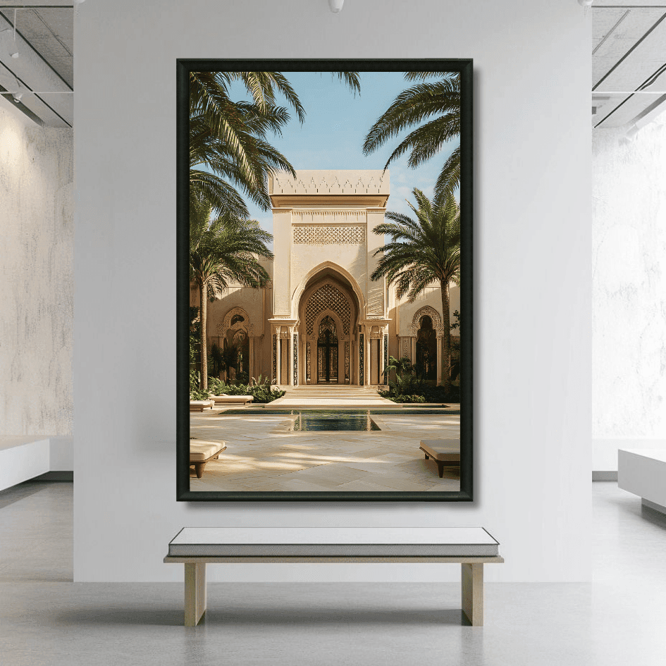 Tableau artistique d’un majestueux palais marocain avec arches sculptées, piscine centrale et palmiers luxuriants. Une pièce maîtresse pour une déco... En savoir plus