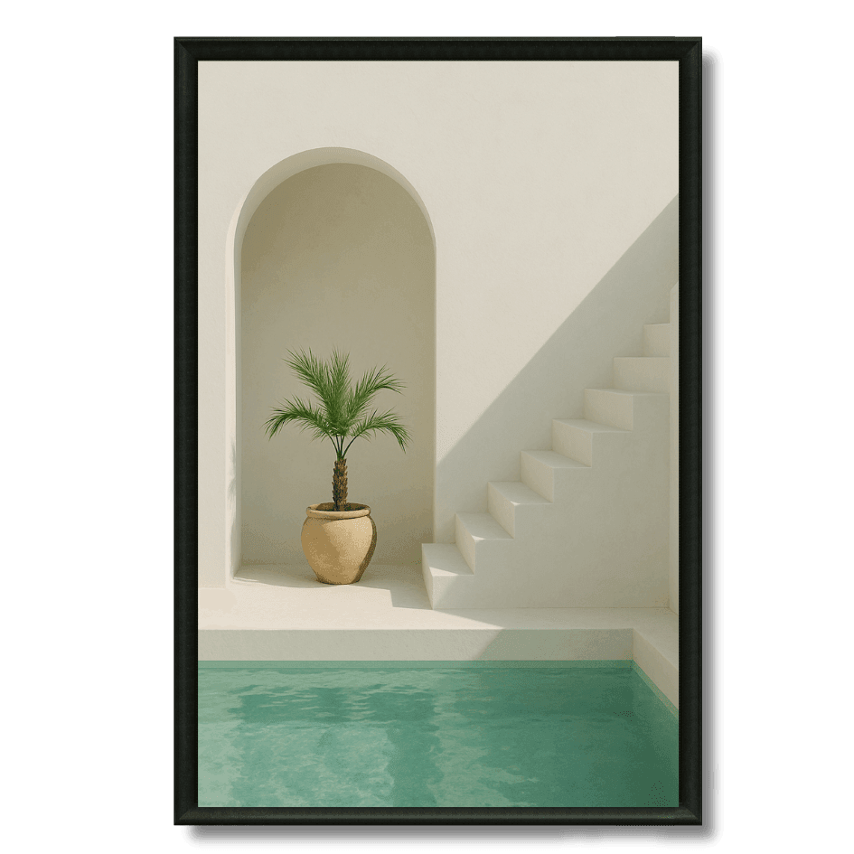 Tableau décoratif montrant un patio blanc immaculé avec escalier et piscine turquoise, ambiance minimaliste et méditerranéenne. ✔ Impression haut de... En savoir plus