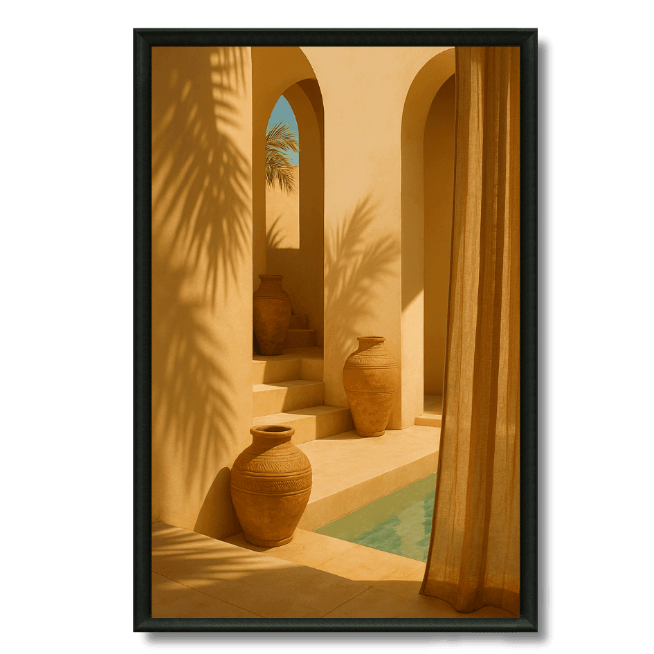 Tableau mural représentant un patio marocain baigné de soleil, avec jarres en terre cuite et arches élégantes. Parfait pour une... En savoir plus