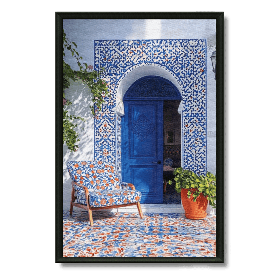 Tableau lumineux illustrant une porte bleue traditionnelle du Maroc, encadrée de zellige et accompagnée d’un fauteuil assorti. Idéal pour une... En savoir plus