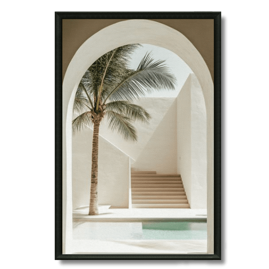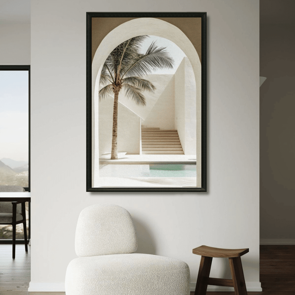Ce tableau minimaliste capture la douceur méditerranéenne avec un palmier gracieux, des murs blancs et une piscine rafraîchissante. ✔ Impression... En savoir plus
